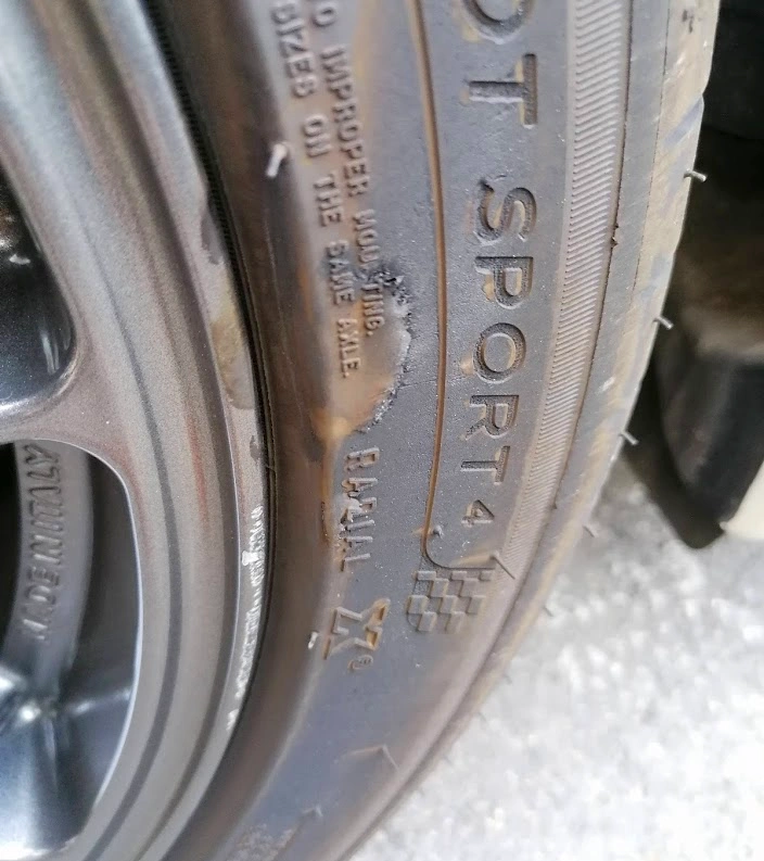A todo esto el arañazo de la llanta ha sido por culpa de mi columna de la derecha, siempre dejo algo de distancia entre la columna y el lateral pero esta vez el volante estuvo un poco girado y solo con un poquito que lo desplace ya toco la llanta, no se si me explico, menos mal que no fue nada de chapa.